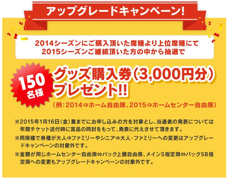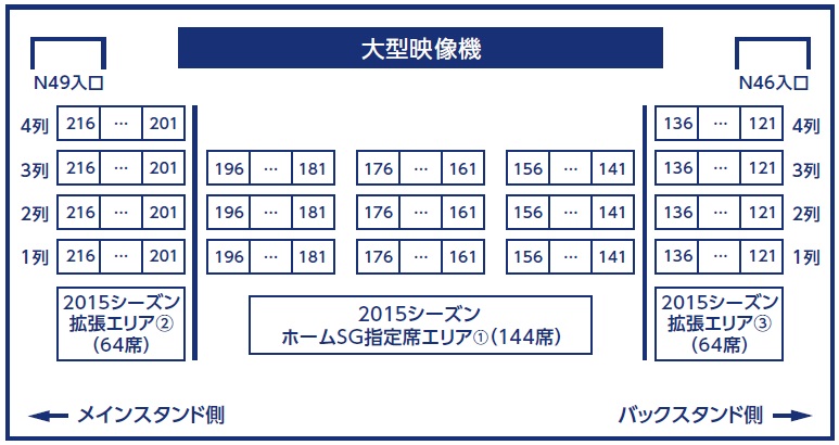 2.ホームセンター自由席のブロック数は、2014シーズン同様3ブロックを予定しておりますが、年間チケット申込状況次第で4ブロックに拡大する可能性がございます。拡大時には当クラブホームページにてお知らせいたします。